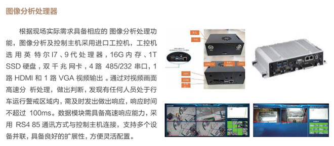 6、行車智控系統(tǒng):控制系統(tǒng)采用一體化模塊集成設(shè)計(jì), 通過各子系統(tǒng)信號(hào)采集及圖像分析進(jìn) 行智能處理,快速準(zhǔn)確判斷各功能模 塊的異,F(xiàn)象,與主機(jī)PLC控制系統(tǒng) 通訊連接具備自動(dòng)進(jìn)行報(bào)警、減速、斷電停車等功能,當(dāng)系統(tǒng)確認(rèn)發(fā)出信號(hào)指令后,控制系統(tǒng)和行車PLC連鎖進(jìn)行斷電處理,避免事故發(fā)生。