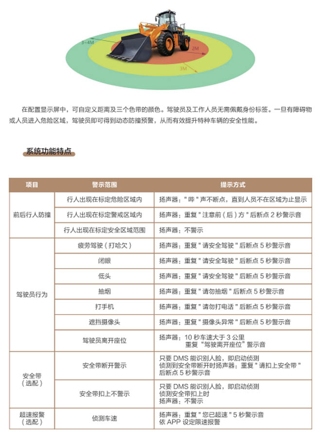 特種車輛智能識別防撞預警系統(tǒng)是專為工程車輛叉車、裝載機、挖掘機、推土機、礦山港口移動車輛設備所設計的智能識別防撞預警安全裝置,能夠?qū)崟r偵測工作區(qū)域的危險狀態(tài)并提供警示,有助于提升預防工程特種車輛作業(yè)安全。一旦有障礙物或人員進入危險區(qū)域,駕駛員可得到動態(tài)防撞預警并發(fā)出報警進行實時減速或停車,該系統(tǒng)能在各種復雜廠區(qū)路況及工礦環(huán)境中幫助駕駛員避免危險,預防事故發(fā)生減輕壓力,提供豐富的駕駛員輔助環(huán)境感知等功能