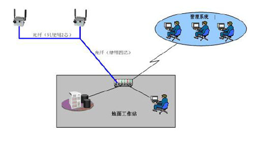 2、每個(gè)地面無線網(wǎng)絡(luò)基站內(nèi)放置: 無線AP 外接全向天線 多模光纖收發(fā)器 3、地面工作站交換機(jī)連接內(nèi)部管理系統(tǒng)網(wǎng)絡(luò)。