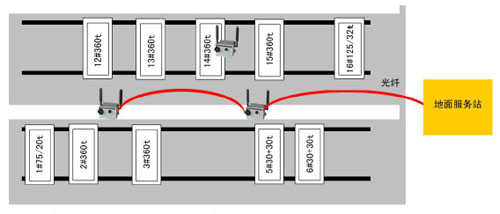 說明: 1、2個(gè)地面無線網(wǎng)絡(luò)基站安裝在起重機(jī)大車跨的左右兩端中間位置,通過光纖連接連接到地面工作站交換機(jī)。 下圖為一個(gè)無線基站布置示意圖: