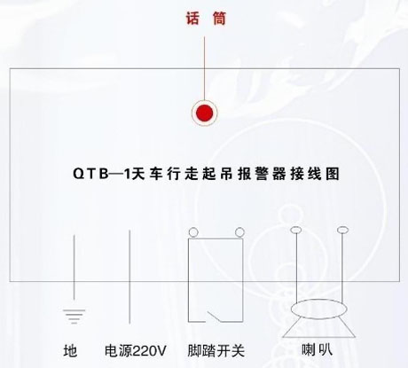 QTB―1天車行走起吊報警器系列產(chǎn)品是專門為天車設(shè)計的報警裝置,在天車行走、起吊時發(fā)出聲光報警信號,增強(qiáng)生產(chǎn)人員的安全意識。當(dāng)天車運行或起吊機(jī)構(gòu)起動時,通過外部繼電器觸點接通裝置,使閃光燈發(fā)出旋轉(zhuǎn)紅光,揚(yáng)聲器發(fā)出報警聲響,以提示生產(chǎn)人員。天車在行走起吊或靜止時,按住送話器的開關(guān),司機(jī)可以對外喊話。該裝置由AC220V電源輸入,有兩組可選的開關(guān)量輸入,一組16歐15-25瓦揚(yáng)聲器,詳細(xì)原理框圖請參閱附錄。