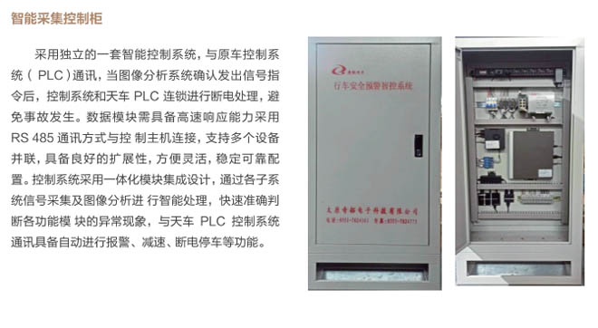 6、行車智控系統(tǒng):控制系統(tǒng)采用一體化模塊集成設(shè)計(jì), 通過各子系統(tǒng)信號(hào)采集及圖像分析進(jìn) 行智能處理,快速準(zhǔn)確判斷各功能模 塊的異,F(xiàn)象,與主機(jī)PLC控制系統(tǒng) 通訊連接具備自動(dòng)進(jìn)行報(bào)警、減速、斷電停車等功能,當(dāng)系統(tǒng)確認(rèn)發(fā)出信號(hào)指令后,控制系統(tǒng)和行車PLC連鎖進(jìn)行斷電處理,避免事故發(fā)生。