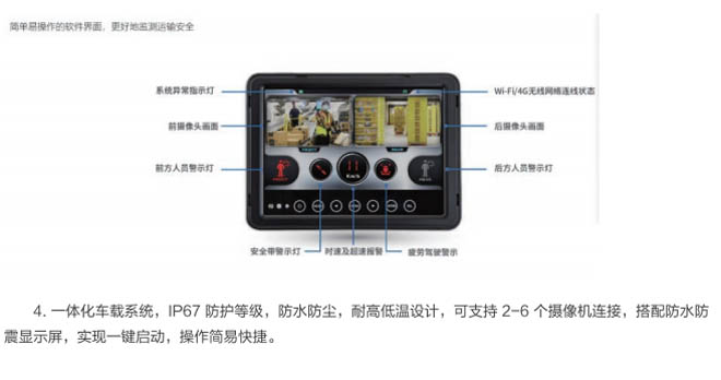 4.智能集成化設計,一鍵開啟車載系統(tǒng),AI精準識別、人車防撞、車車防撞、盲區(qū)防撞等。