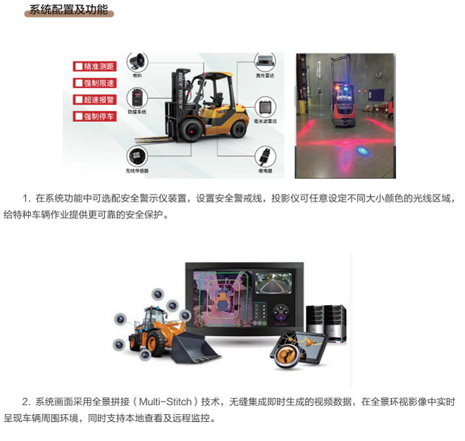 1.基于360°全景環(huán)視監(jiān)控技術,任意設定警戒區(qū)域、危險區(qū)域大小及形狀,無死角保護車輛設備駕駛作業(yè)安全,最大偵測范圍4-5米,防撞距離掃描達20米以上,安裝投影儀可設置警戒線,投影光線在地面形成一個安全范圍